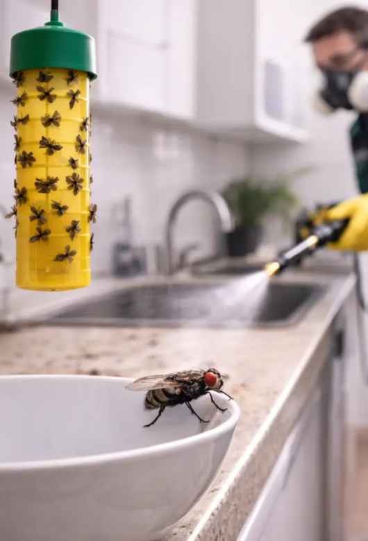 Les mouches se posent sur les surfaces de cuisine, plans de travail, poubelles et zones alimentaires. Elles transportent des bactéries et contaminent rapidement.